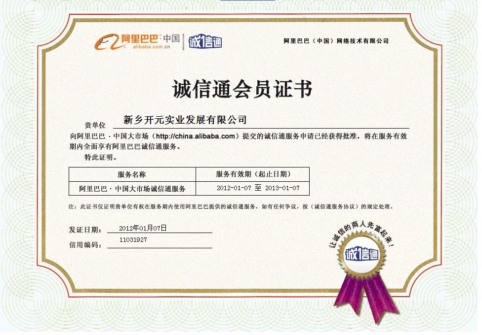 誠信通會員證書